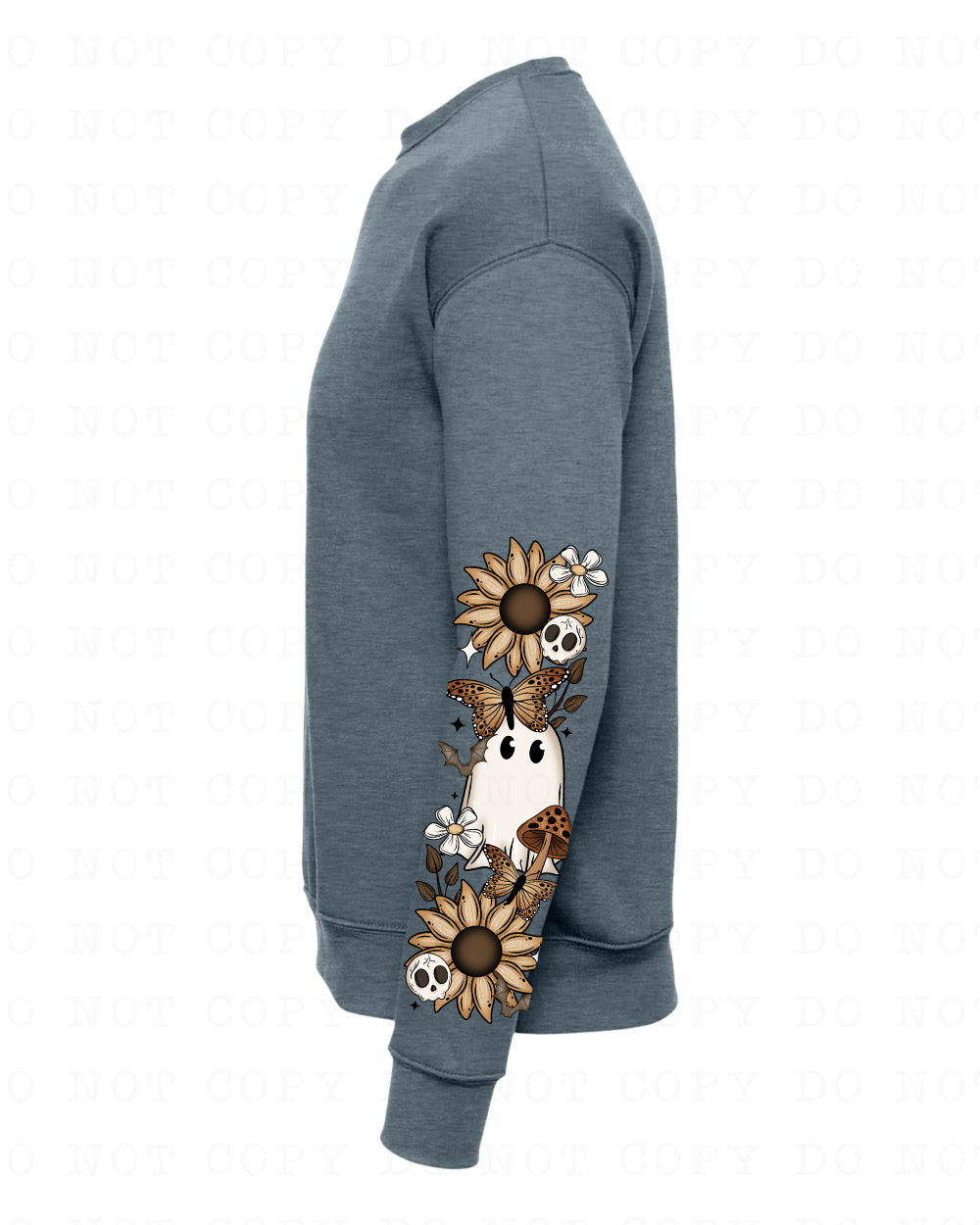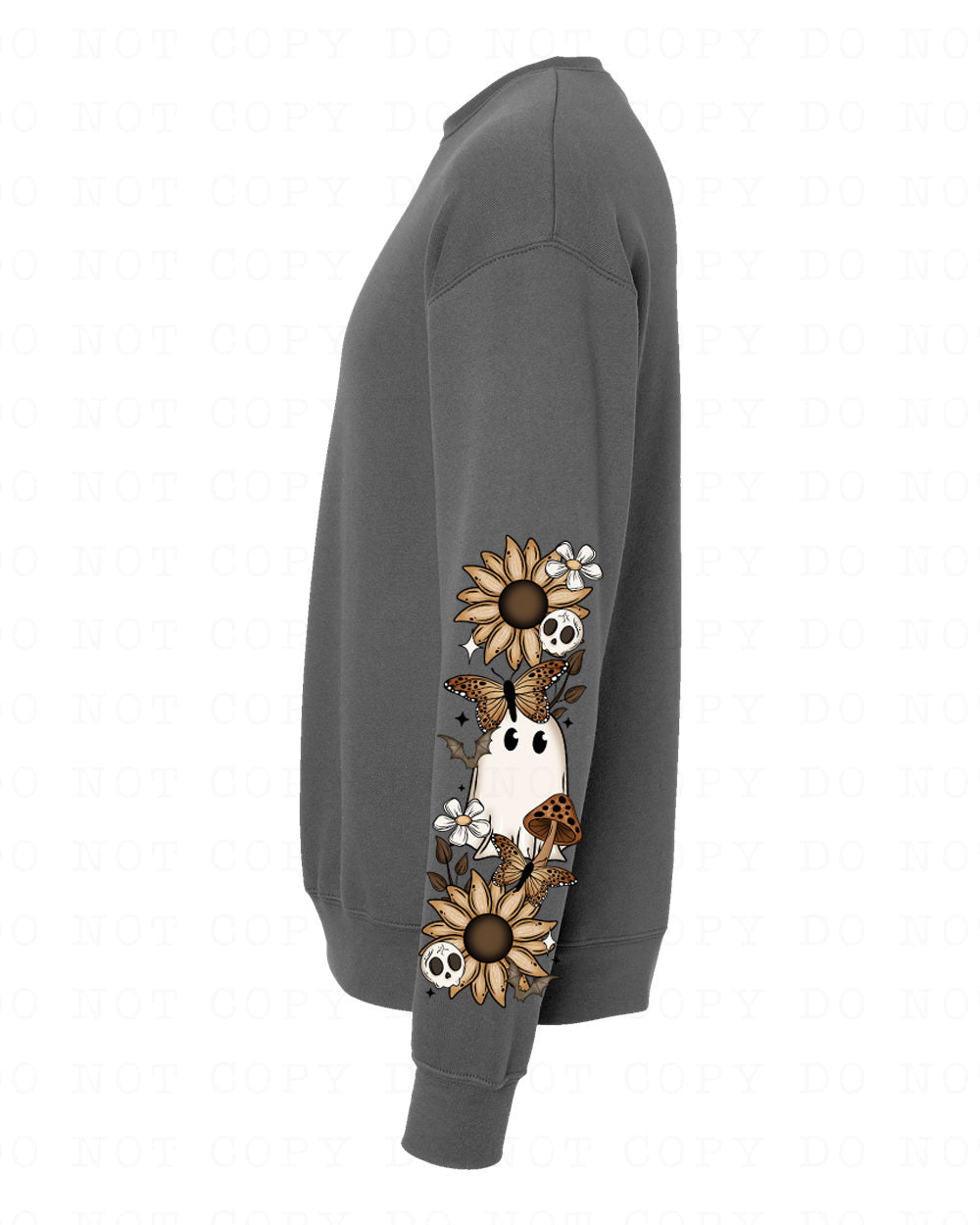 Step into fall with Beautiful Evil’s Cottagecore Ghost, available in two moody shades—Asphalt and Slate. Featuring a whimsical ghost surrounded by sunflowers, mushrooms, bats, butterflies, and moon phases, this sweatshirt blends gothic streetwear with cozy autumn vibes.