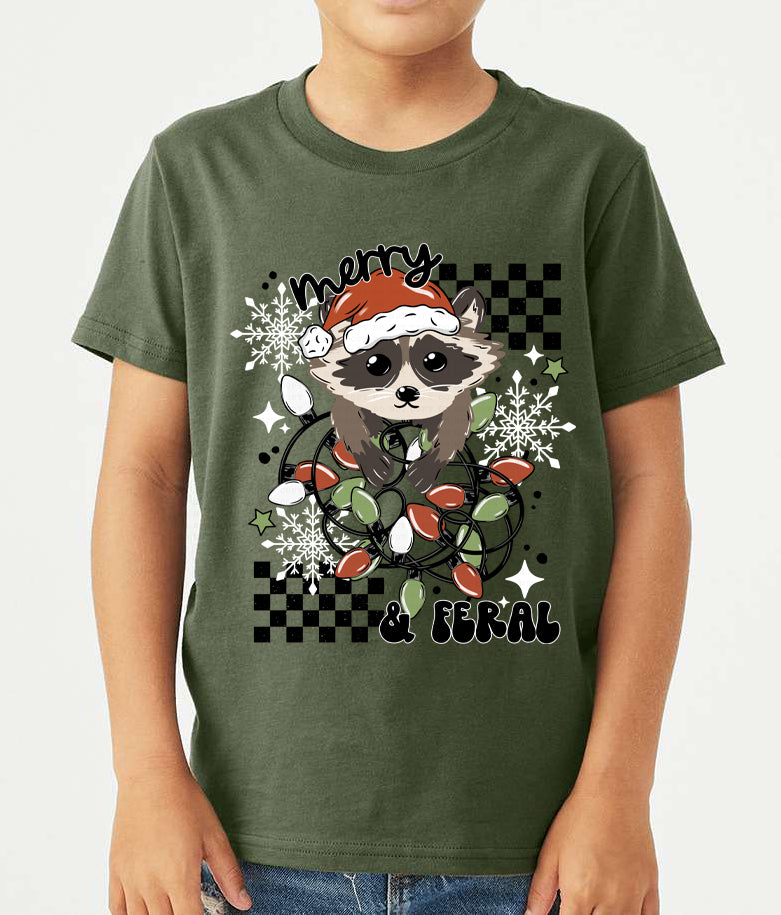 The Merry & Feral Tee — a funny Christmas raccoon design printed on Sage for adults and Military Green for kids and toddlers. Cozy chaos for the whole family.